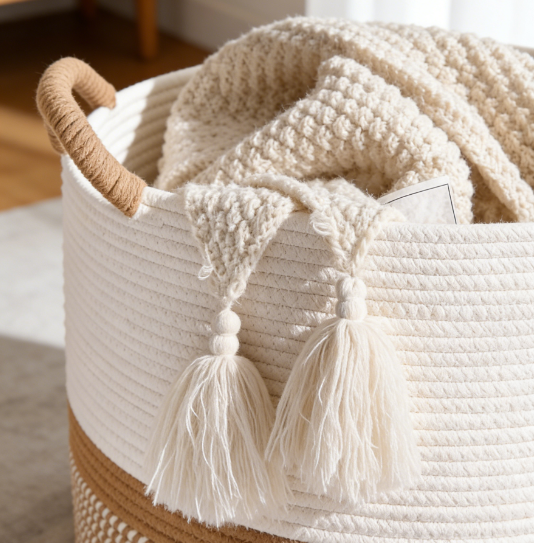 Cotton rope woven blanket basket, suitable for organizing clothes and toys in a nursery or living room.