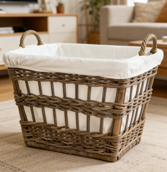 Classic Rattan Laundry Basket: This rattan laundry basket features a handle for easy movement, a removable fabric lining, and bottom pads to minimize direct contact with the ground.
