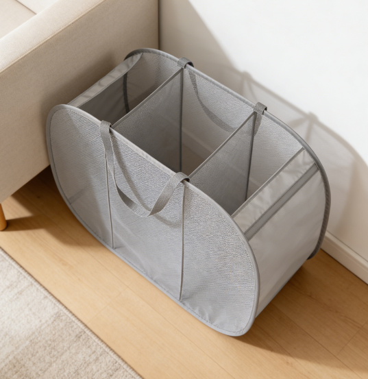 Mesh pop-out three-section laundry basket for categorized clothing storage, folds horizontally for use in the laundry room.