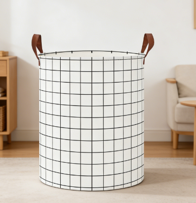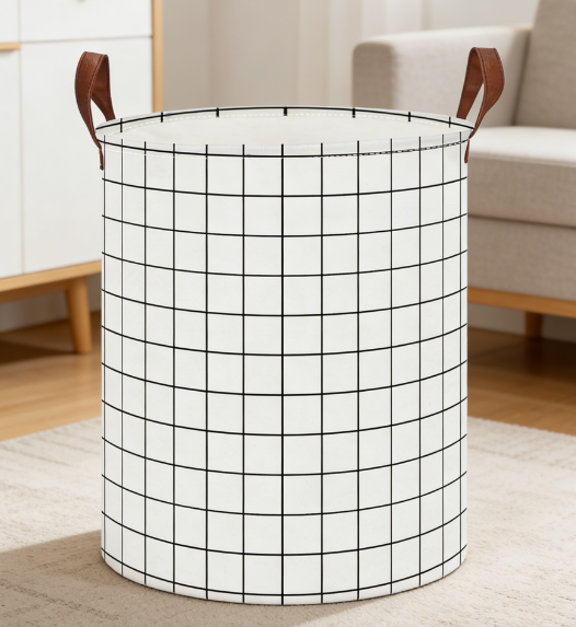 Round, foldable laundry basket for organizing clothes, white checkered pattern.
