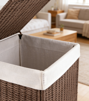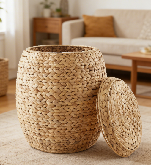 Woven construction: The round woven exterior complements different home environments. An internal metal frame enhances overall stability, and the lid allows for easy concealment of stored items.